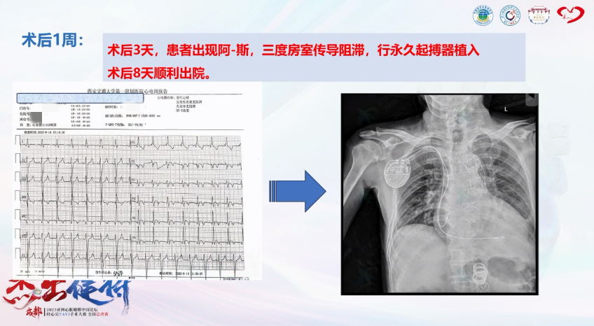 术后第3天出现阿-斯综合征,心电图示三度房室传导阻滞,行永久起搏器植入;术后第8天顺利出院。