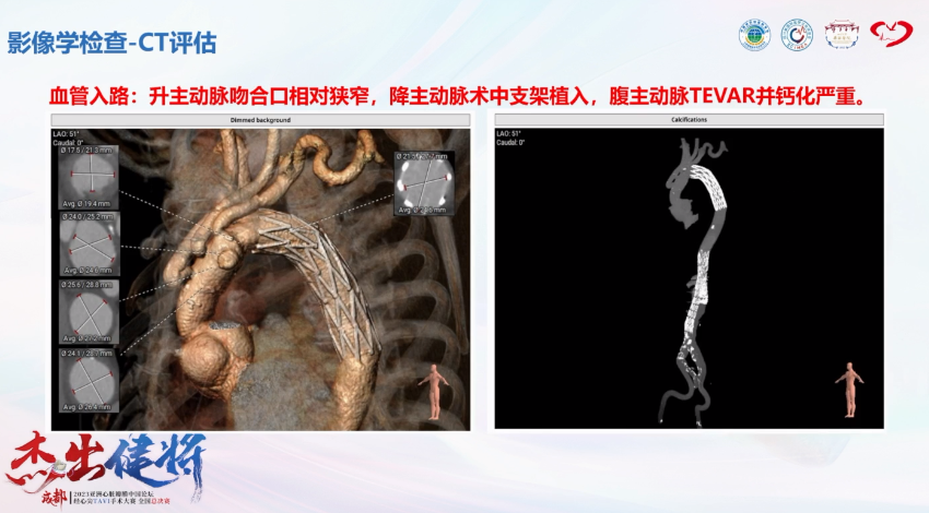 血管入路评估:升主动脉吻合口相对狭窄,降主动脉术中支架植入,腹主动脉TEVAR并钙化严重。