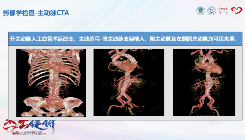 主动脉CTA提示:夹层术后改变;冠脉CTA提示:主动脉窦明显增宽。