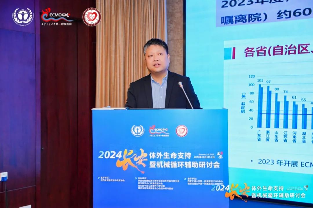 郭锋伟教授首先向与会嘉宾们分析了国内ECMO的开展现状,随后介绍道,2023年度陕西省共有25家中心开展了ECMO支持,陕西省ECMO非康复出院率较2022年有明显上升。在此背景下,西安交通大学第一附属医院成果显著,不仅成立了优秀ECMO培训数量,还使得ECMO例数不断增加。同时,医院聚焦ECMO、LVAD以及心脏移植,充分发挥三者在治疗终末期心脏病患者的协同作用。