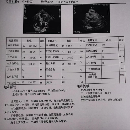 心脏超声:LA35mm,LV44mm,EF70%,主动脉瓣轻度狭窄,二、三尖瓣轻度关闭不全,室间隔增厚(13mm),左室舒张功能减低。