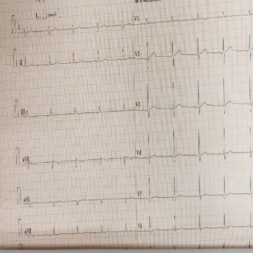 心电图:窦性心律,心率56次/分,V5-6导联T波低平。