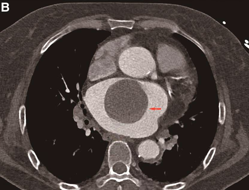 B 患者CT显示左心房内巨大的肿物(箭头所指为左心房内的肿物)。