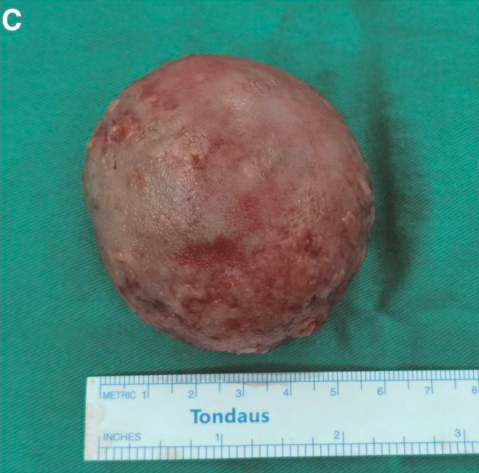 根据超声心动图和CT结果,怀疑患者左心房内存在巨大黏液瘤。患者接受了左心房肿物切除术(图1C)。