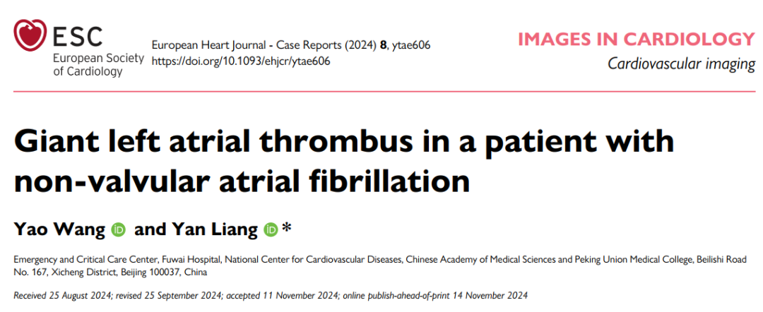 房颤患者容易在左心房形成血栓,这些血栓如果脱落,可以通过血液循环进入到其他部位,造成严重的并发症,比如脑卒中以及全身脏器的栓塞。因此,对于房颤患者,抗凝治疗是非常重要的预防措施。近日,阜外医院团队在《Eur Heart J Case Rep》发表了一份题为“Giant left atrial thrombus in a patient with non-valvular atrial fibrillation”的个案报道,讲述了极为罕见的非瓣膜性房颤患者左心房巨大血栓的诊治过程。