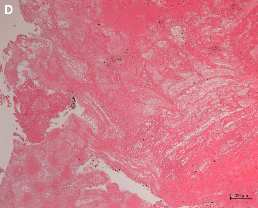 大体病理检查证实,肿物呈球形,表面光滑,大小为6.5cm×5.5cm×4.6cm,病理证实为血栓,无恶性肿瘤的证据(图1D)。