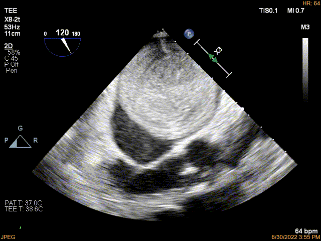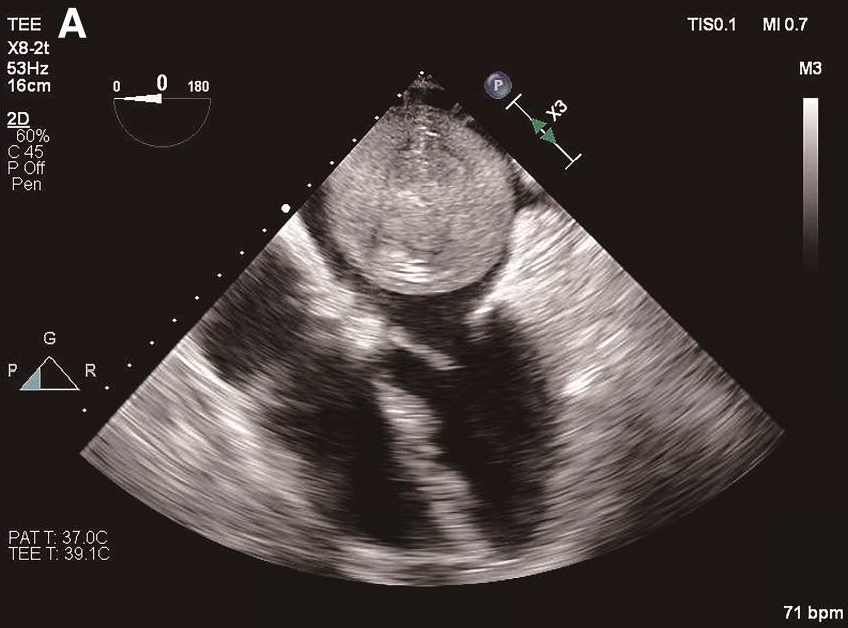 A 经食道超声检查发现左心房内有一个58×55mm的可移动球形肿物。