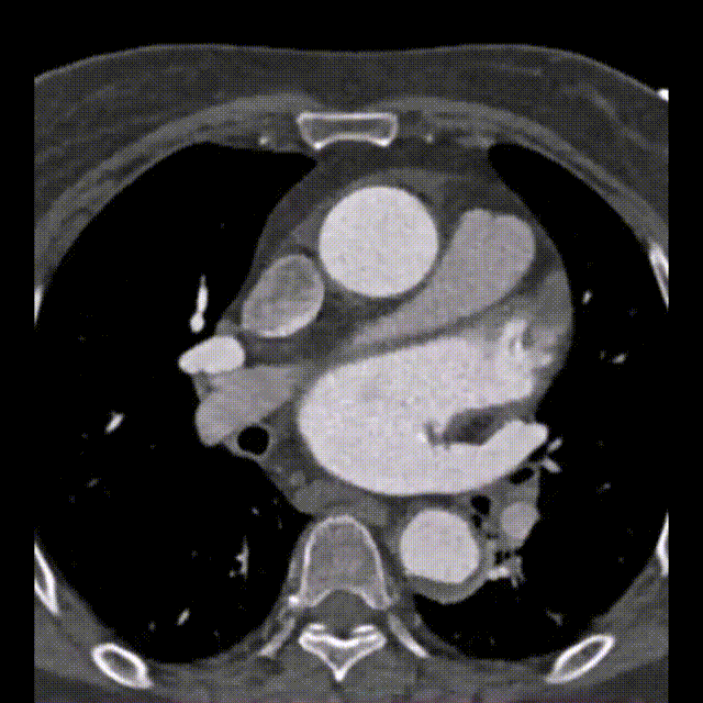左心房CT显示,扩大的左心房内存在一个巨大的、光滑的、边界清楚的充盈缺损,与房间隔中部紧密相连。在舒张期,肿物位于二尖瓣口附近(图1B和视频)。