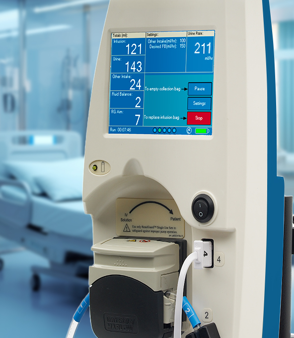 该装置由控制台和一次性使用组件组成(图2)。控制台通过专利软件和电子体重测量技术,实时监控并调节液体输注速率。而一次性组件则包括尿液收集装置和静脉输液装置,确保患者补液需求的精确匹配。这种匹配的液体置换旨在最大限度地减少过度或不足水合的风险,此项创新技术在临床研究中表现非凡,数据显示RenalGuard系统可以将肾脏损伤降低60%到80% [8,9] 。RenalGuard系统特别是在在慢性肾功能不全这类高危急性肾损伤患者群中表现出了明显的优势,在接受RenalGuard治疗的患者中,与对照组相比,相对风险降低率为53%[10]。