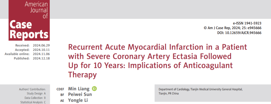 冠脉扩张症定义为弥漫性扩张累及范围超过其长度的1/3以上,且扩张段的直径是相邻正常段直径的1.5倍以上。这与冠脉瘤的定义不同,后者是指冠脉某段直径超过相邻正常冠脉段直径的1.5倍,且累及范围占总长度的1/3以下。冠脉扩张症有时会导致急性冠脉综合征。研究显示,扩张段存在明显的血流缓慢现象,可能导致缺血和血栓形成。近期,天津医大总医院李永乐教授团队在《American Journal of Case Reports》报道了一份特殊病例“Recurrent Acute Myocardial Infarction in a Patient with Severe Coronary Artery Ectasia Followed Up for 10 Years: Implications of Anticoagulant Therapy”,报告了一例在9年间因同一冠脉扩张病变部位局部血栓形成导致再发心肌梗死的病例,并讨论了长期抗凝治疗的有效性。