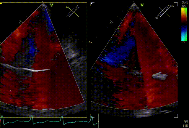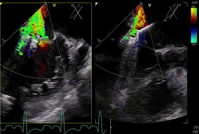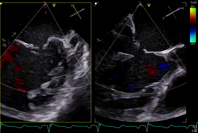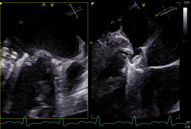 释放后内侧后叶仍旧栓系,反流较重,内外侧都残余反流,内侧为主,考虑到内侧反流较宽,瓣叶够长,栓系难以捕捞,压差不高,第二枚夹子选择XTW,置入第二枚XTW后,在1区上方做轨迹测试,充分释放张力,调整夹子的夹臂方向位于5点-11点的位置,回拉系统,使第二枚夹子位于3区,关小夹子进入到心室侧,由于第一枚夹子起到了稳定瓣叶的作用,第二枚夹子捕捞夹持也异常顺利,一次精准捕获前叶和后叶,再次完整评估二尖瓣夹XTW的方向、组织桥稳定性、瓣叶受限程度及反流减小程度。前后叶Bouncing明显,但是反流却明显增加,开始未明确原因,Orientation,夹持量均无问题,但是内侧还残余反流,考虑内侧可能还要补,决定打开贴近第一个夹子放置,如果有需要内侧再补,此时发现由于患者EF值低,麻醉老师肾上腺素一直在给,心脏搏动较为剧烈,反流术中的异常增多可能是由于此原因导致,遂停止给药。