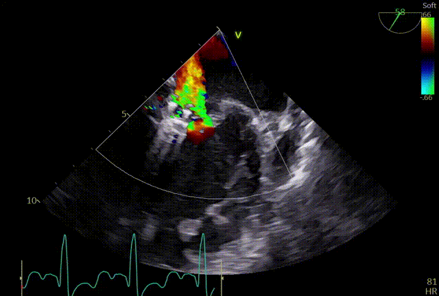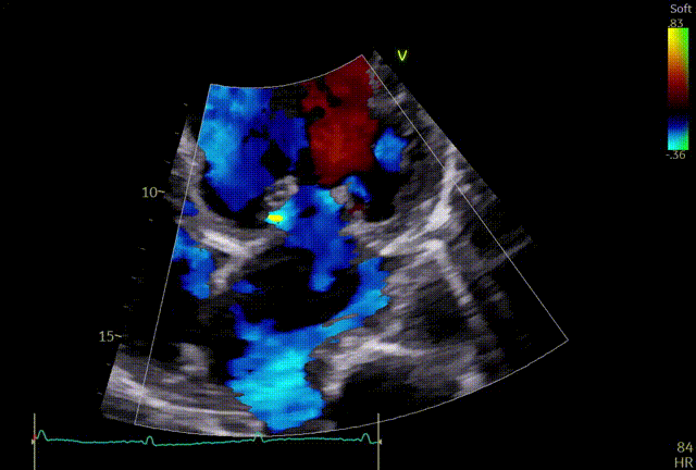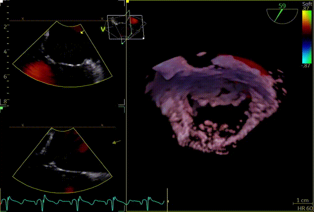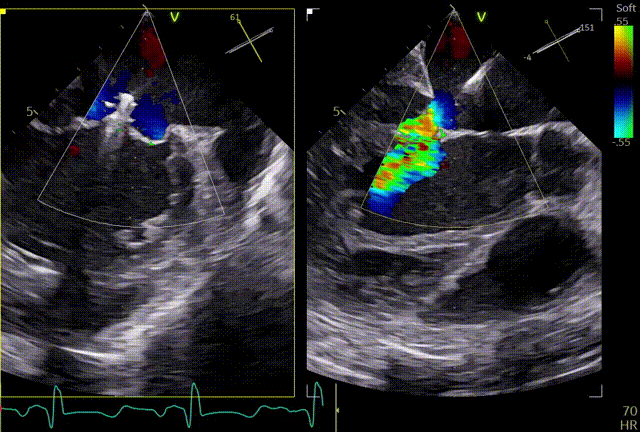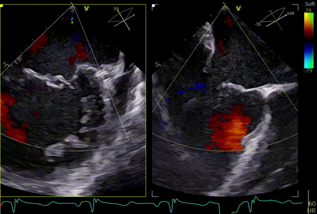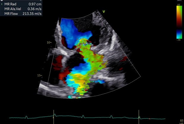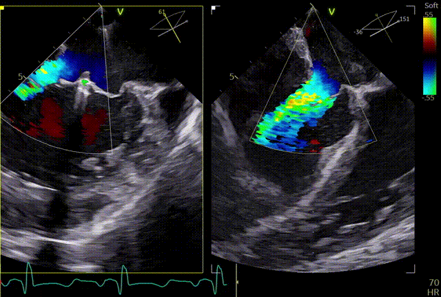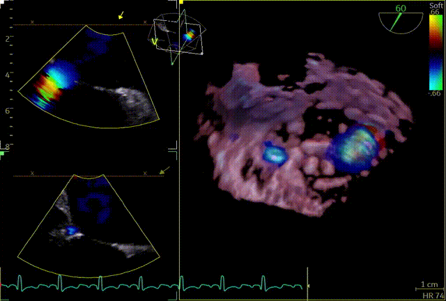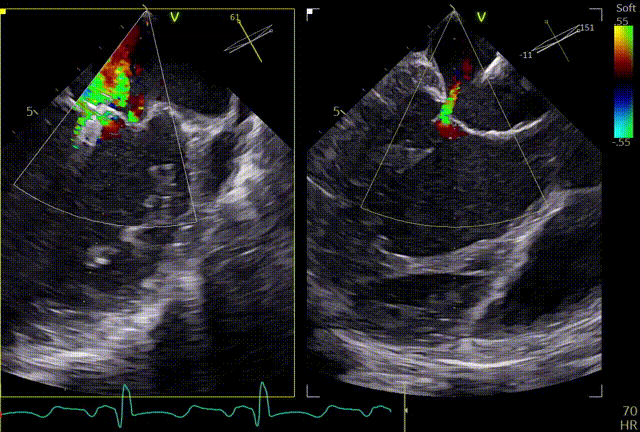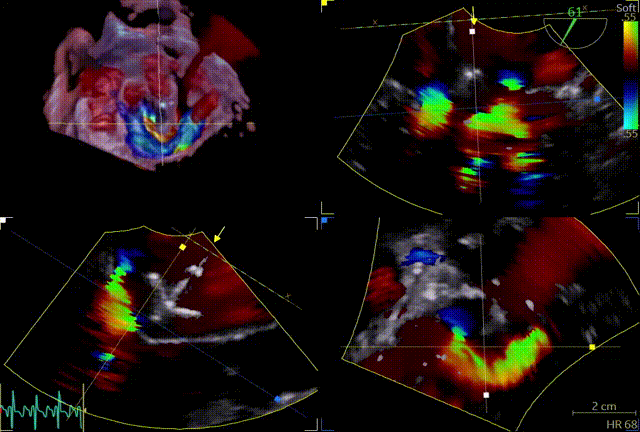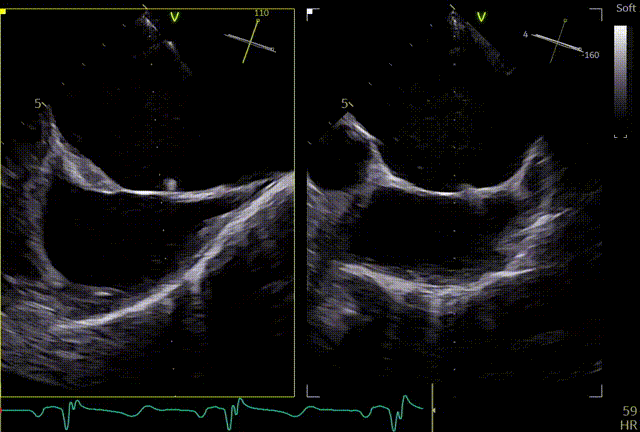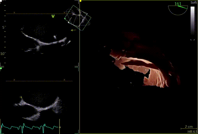 关小夹子,进入到左室后,跨瓣越过瓣叶尖端后,立马打开夹子,三维再次确认夹臂方向未改变,慢慢往上提拉,一次准确捕获瓣叶,前后叶Bouncing明显,后叶接近根部,关紧夹臂,反流量整体减少,但是内外侧都残余反流,内侧为主。反流明显减少,后叶夹持10mm以上,夹子稳定性良好,跨瓣压差小于3mmHg,决定释放。