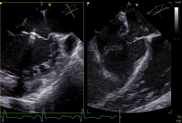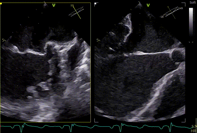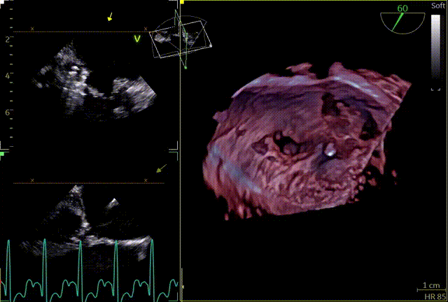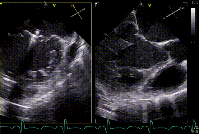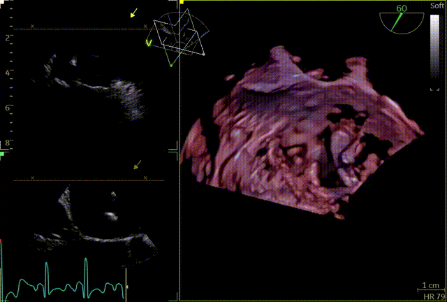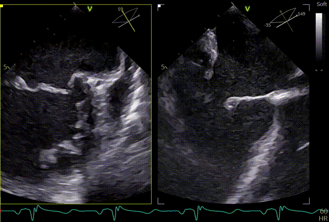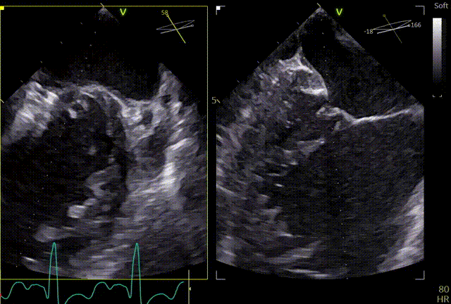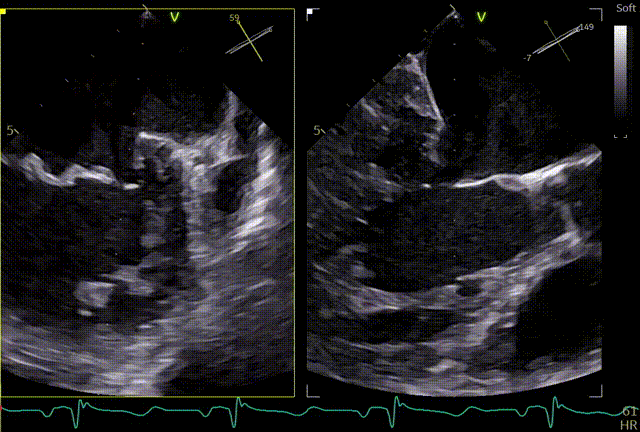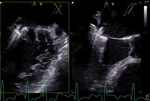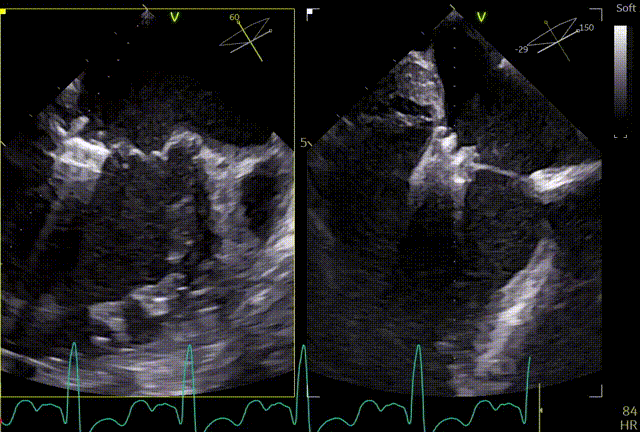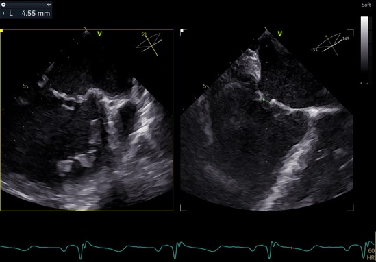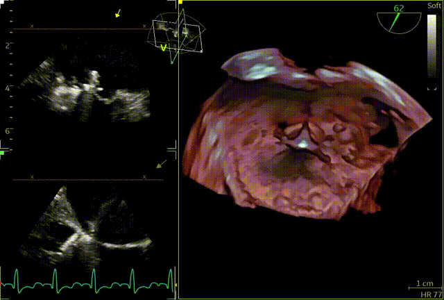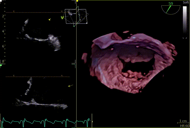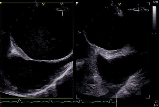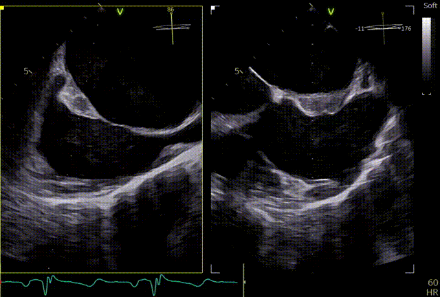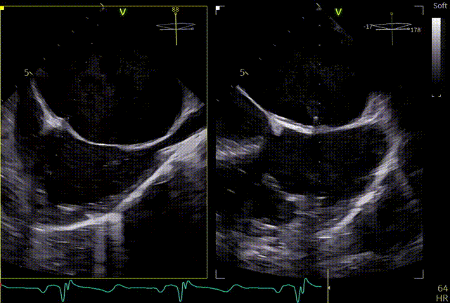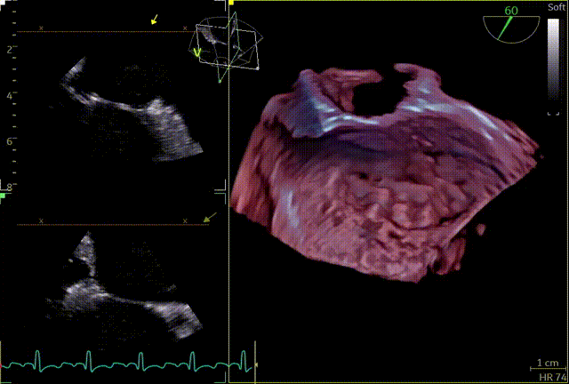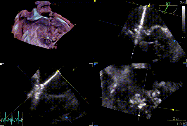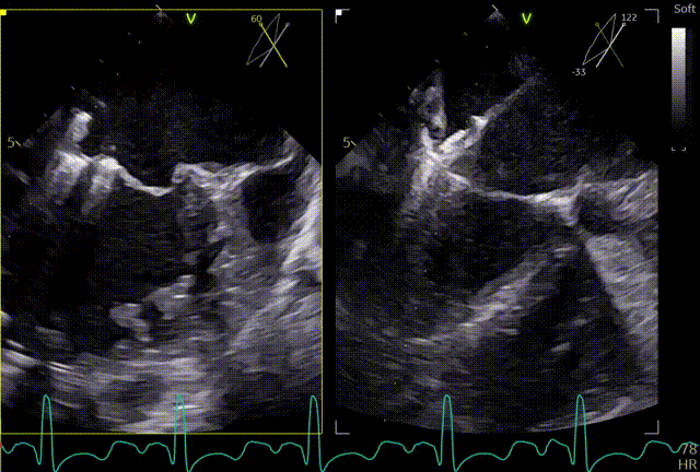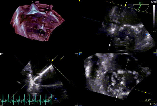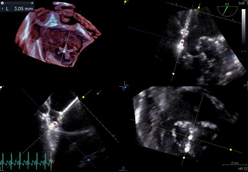 患者全麻,全身覆盖消毒铺巾后,在超声引导下建立右侧股静脉入路,在食道超声引导下,穿刺房间隔,术前左房压较高,平均32mmHg,且心脏转位,穿刺针下拉过程中难以在卵圆窝中部定位,往后转穿刺针滑脱,在靠下的位置穿刺通过,位置太低,重新穿刺,滑脱2次后,下腔靠近肌部产生血肿,最终成功穿刺,穿刺高度4.0cm,SGC置入后,3D复测穿刺高度为3.8cm,然后将二尖瓣夹输送系统XTW送入左心房,到达二尖瓣目标位置,调整二尖瓣夹轨迹和方向,使其垂直于二尖瓣环平面且指向心尖,完成左房初定位,夹臂方向指向12点-6点方向,在瓣上充分释放张力。