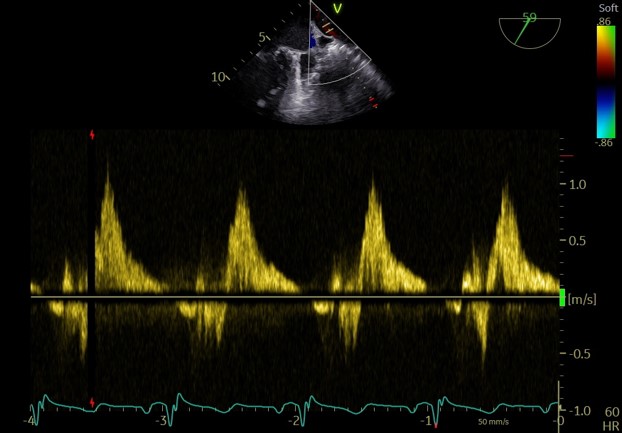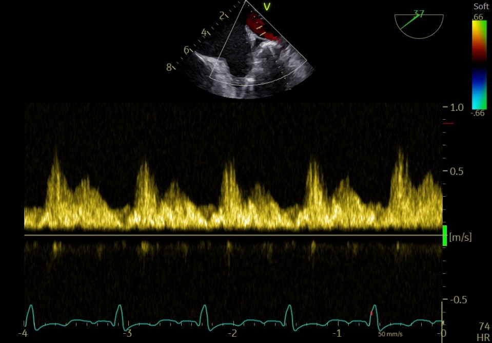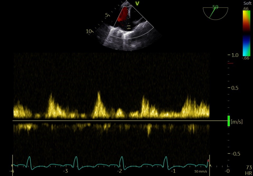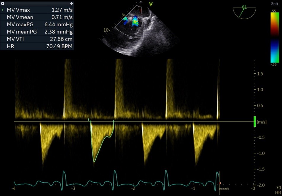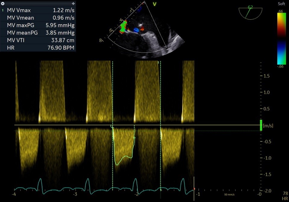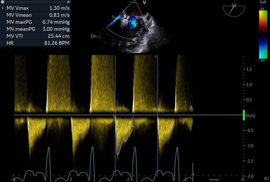 ② 画迹法显示二尖瓣瓣口面积5.25cm²,平均跨瓣压差4.2mmHg;
