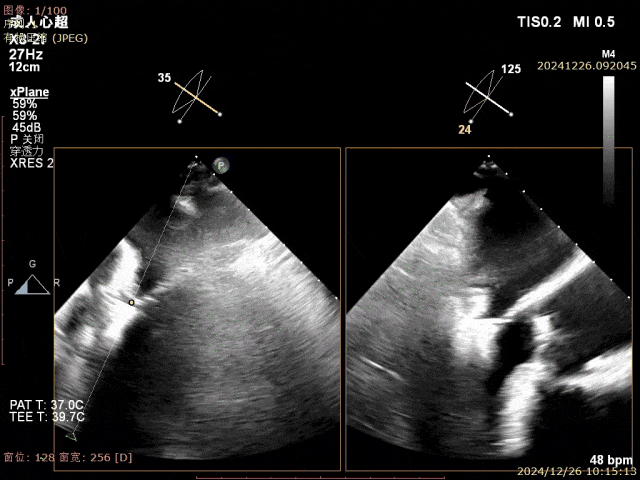 脱垂宽度较宽且高,郭然主任和李世国主任以及段福建主任商议后决定先使用一枚XW0612长宽二尖瓣夹,尽可能多的捕获脱垂瓣叶,争取一枚二尖瓣夹解决脱垂问题,同时可在准备器械时提前调整角度,减少术中二尖瓣夹的操作以降低腱索缠绕的风险