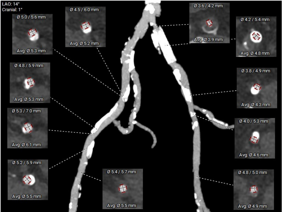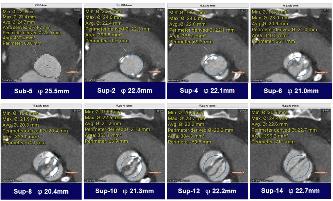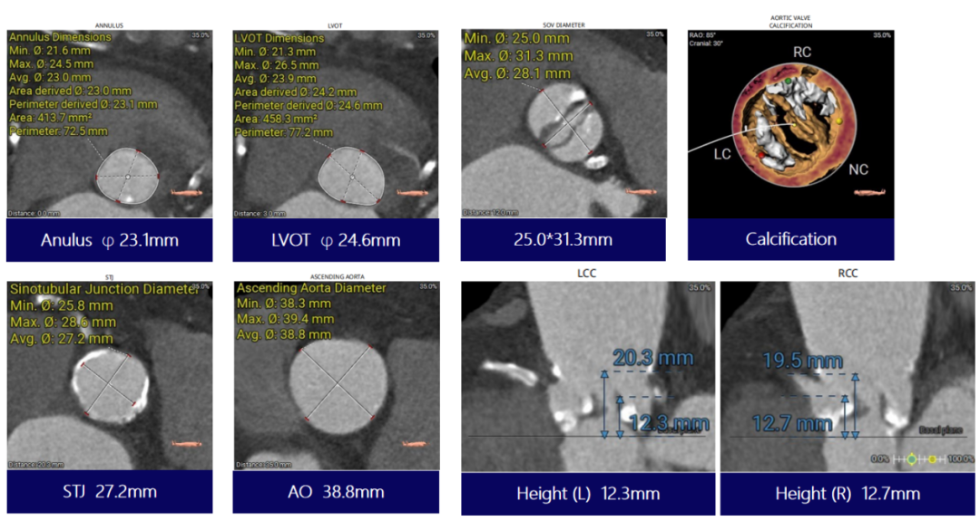 CT评估-基本测量:Type0型二叶瓣,瓣叶钙化较重并增厚,右冠瓣前交界处见团块钙化,瓣环直径23.1mm,流出道直径24.6mm