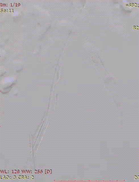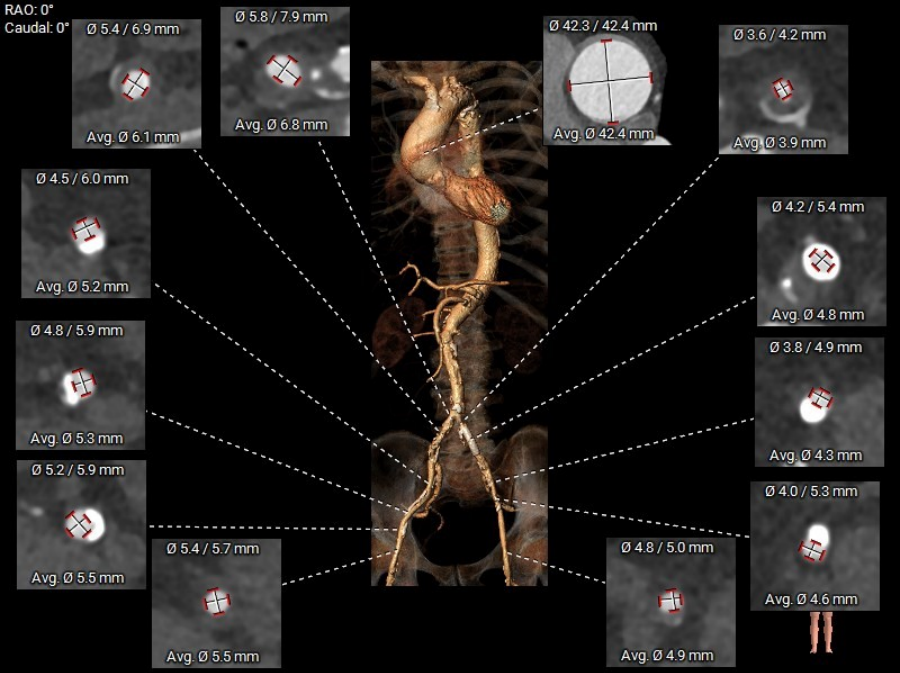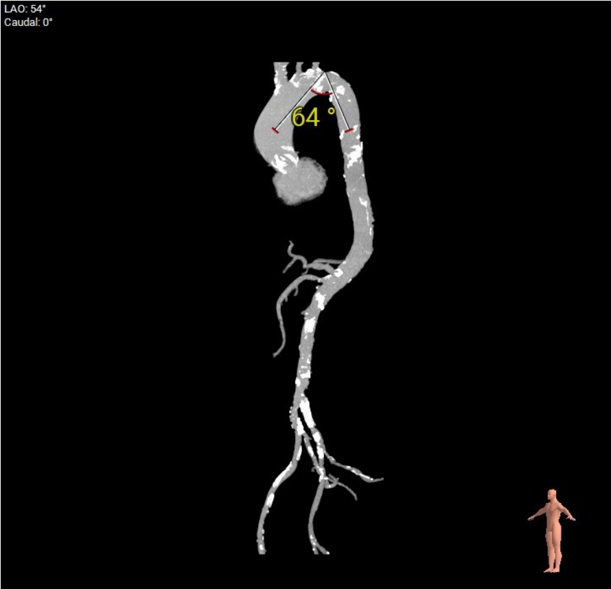 CT评估-外周测量:双侧入路偏细,左侧入路小于5.0mm,右侧髂外段入路最小约5.3mm,见三段长条钙化,考虑输送系统通过难度极大;锐角弓约64°,弓部到髂股动脉钙化较多,股动脉分叉皆位于股骨头以下