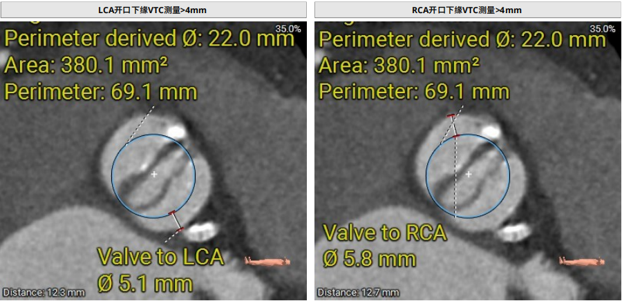 冠脉风险评估:左右冠脉开口高度可,开口下缘见少许瓣叶结构,VTC测量>4mm,冠脉风险不高