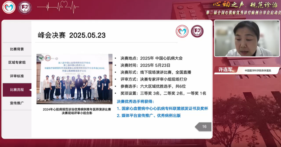 中国医学科学院阜外医院心肌病病区许连军教授详细介绍了本次比赛的评审标准及赛事流程。本次启动会后,将以区域为单位进行病例征集,由区域专家组审核。自2025年2月13日至5月23日,各区域将通过线上或线下方式开展初赛,区域优胜者将进入现场决赛。许连军教授同时指出,本次比赛将充分利用各大公众号、视频号宣传渠道以及丁香园平台,全方位扩大赛事影响力,吸引更多心肌病专科联盟成员单位及广大心肌病专科同道积极参与。