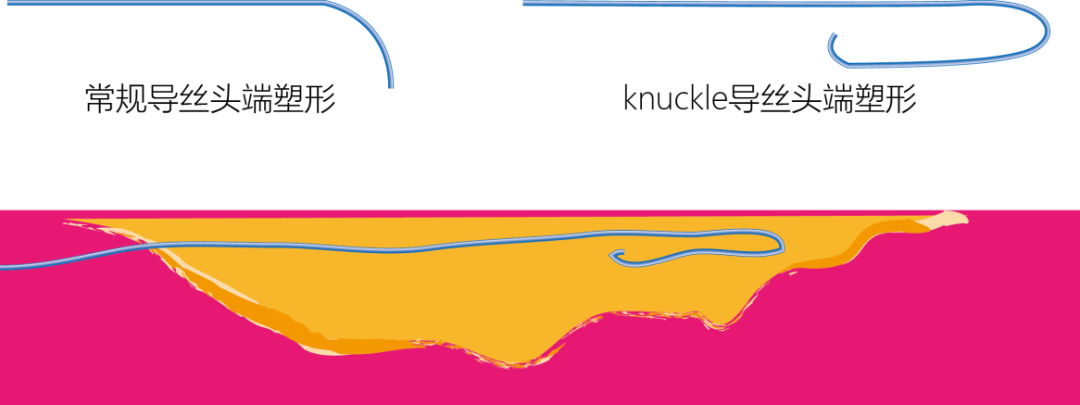 当术者尽所有努力仍无法将导丝推送至真腔时,一种可选方案是将knuckle导丝推送至假腔中,尝试在冠脉的中部或远端与真腔相通,这将在冠脉的中部或远端形成再入真腔点。形成再入真腔点可能会降低夹层假腔内的压力,增加真腔血流,改善血流动力学和症状,并可能为术者执行后续操作提供更多时间。
