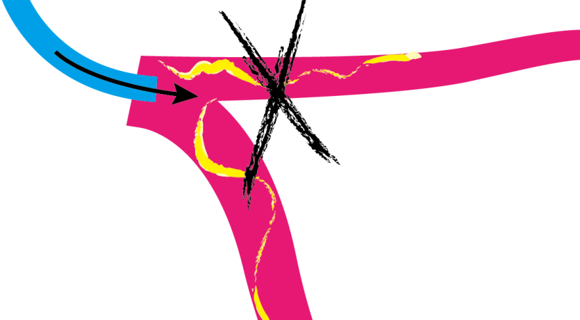 根据本小组一名成员的经验,从与真腔相通而不损伤外膜的角度来看,光滑的中等硬度导丝可能更为理想,而使用假腔knuckle导丝的大多数经验则来自CTO PCI,而非严重冠脉夹层。然而,由于这种方法术者无法控制再入的位置,因此存在假腔扩大的风险。此外,如果knuckle导丝进入侧支,则存在冠脉破裂的风险。当术者尝试在假腔中使用knuckle导丝时,重要的是要确认导丝推送至主支血管而非侧支。此外,重要的是不要强行推送knuckle导丝。