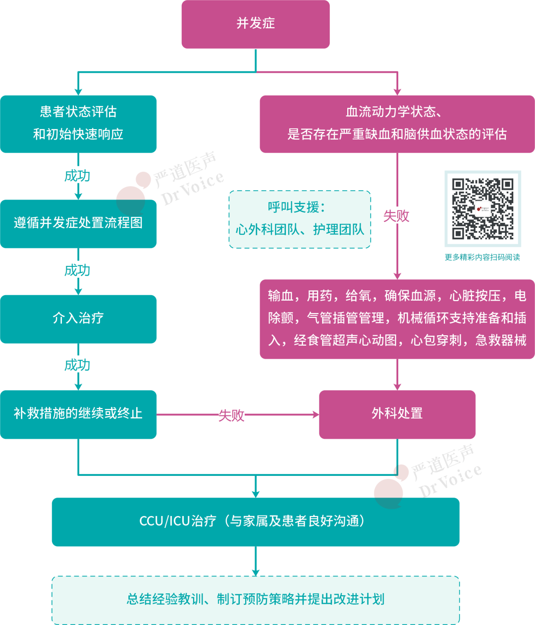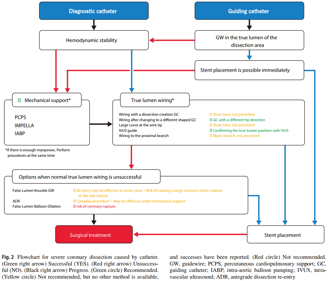 如果真腔送入导丝或真腔内支架植入不成功,则应选择开胸手术。发生严重冠脉夹层时,重要的是立即与心脏外科团队沟通。应在患者出现不可逆严重后果之前进行包括外科手术治疗在内的多学科治疗。