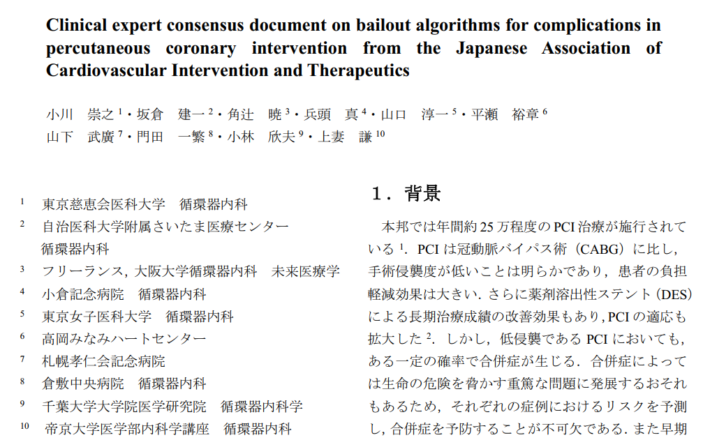 本小组的一名成员曾遇到过冠脉夹层延伸至升主动脉和主动脉瓣的情况,在与心脏外科医生讨论这一病例时,我们了解到,主动脉夹层手术中最重要的关键是闭合夹层入口。换句话说,当冠脉夹层延伸至主动脉时,必须在冠脉内闭合夹层管腔,这应通过PCI而非手术治疗来实现。同一成员还经历了两种情况:一种是用覆膜支架闭合夹层管腔后效果良好,另一种是因犹豫是否植入覆膜支架而导致效果不佳。当对冠脉夹层延伸至主动脉的患者进行包括心脏手术在内的多学科治疗时,重要的是在与心脏外科医生讨论冠脉内夹层管腔的闭合后,找寻最佳治疗方案。