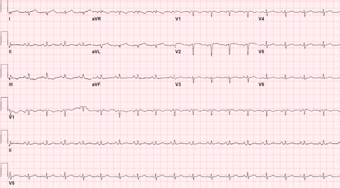 实验室检查显示,患者基线肌钙蛋白升高至2454 ng/L,2小时后肌钙蛋白2506 ng/L(差值为53),BNP 132 pg/L,代谢指标、ESR、CRP及TSH正常。血常规示红细胞计数5.29×10⁶/uL,血细胞比容48.3%。心电图示窦性心动过速伴电轴右偏,患者为低电压(心室率108次/分,QTc 420)(图2)。胸片显示心影增大,双肺清晰。CT示心包积液。