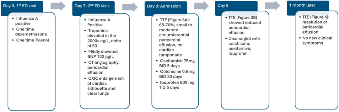治疗策略采用抗炎(布洛芬+秋水仙碱)联合抗病毒(奥司他韦)。文献支持抗病毒治疗可缩短症状持续时间并降低心脏并发症风险。Ward等人的研究发现,奥司他韦治疗流感且有心脏病史的住院患者显著降低了复发性心血管事件(如心肌梗死、心绞痛、中风、心力衰竭和心源性猝死)的风险。值得注意的是,患者首次就诊时未及时使用抗病毒药物,可能为后续心脏并发症的诱因之一。