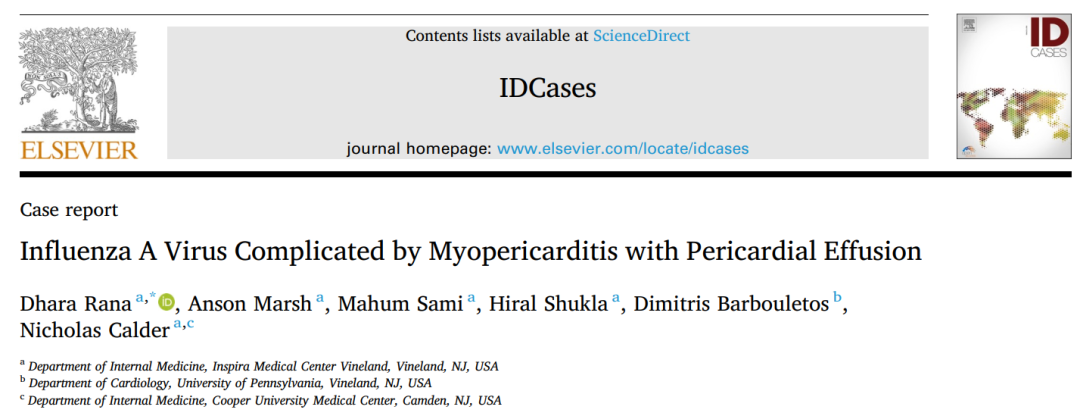 近日,知名女星因流感继发肺炎,在日本不幸离世。这一突发事件不仅让广大公众深感惋惜,也再次引发了人们对流感这一常见却不可小觑疾病的关注。心血管内科也时常遇到流感患者,流感可能会对心血管系统会有哪些影响呢,《IDCases》报道了一例罕见病例“Influenza A Virus Complicated by Myopericarditis with Pericardial Effusion”,见证了流感的厉害,供各位同道参考。