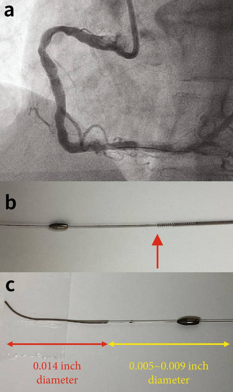 图2. (a)最终冠状动脉造影。(b)断开的旋磨头和驱动轴的边缘(红色箭头)。(c)旋磨导丝的远端和主体部分。