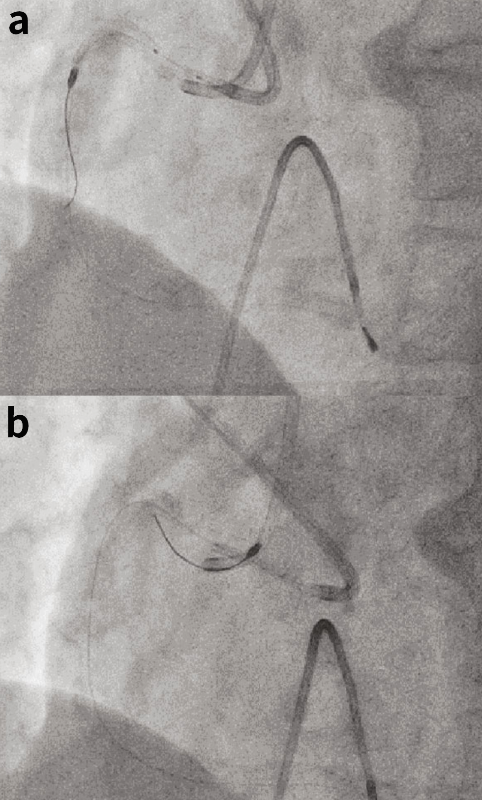 图4. (a)推进延长导管,直到其头端接触到。然后将延长导管、旋磨导丝和磨头一起拉出。(b)成功将旋磨头拉入到指引导管中取出。