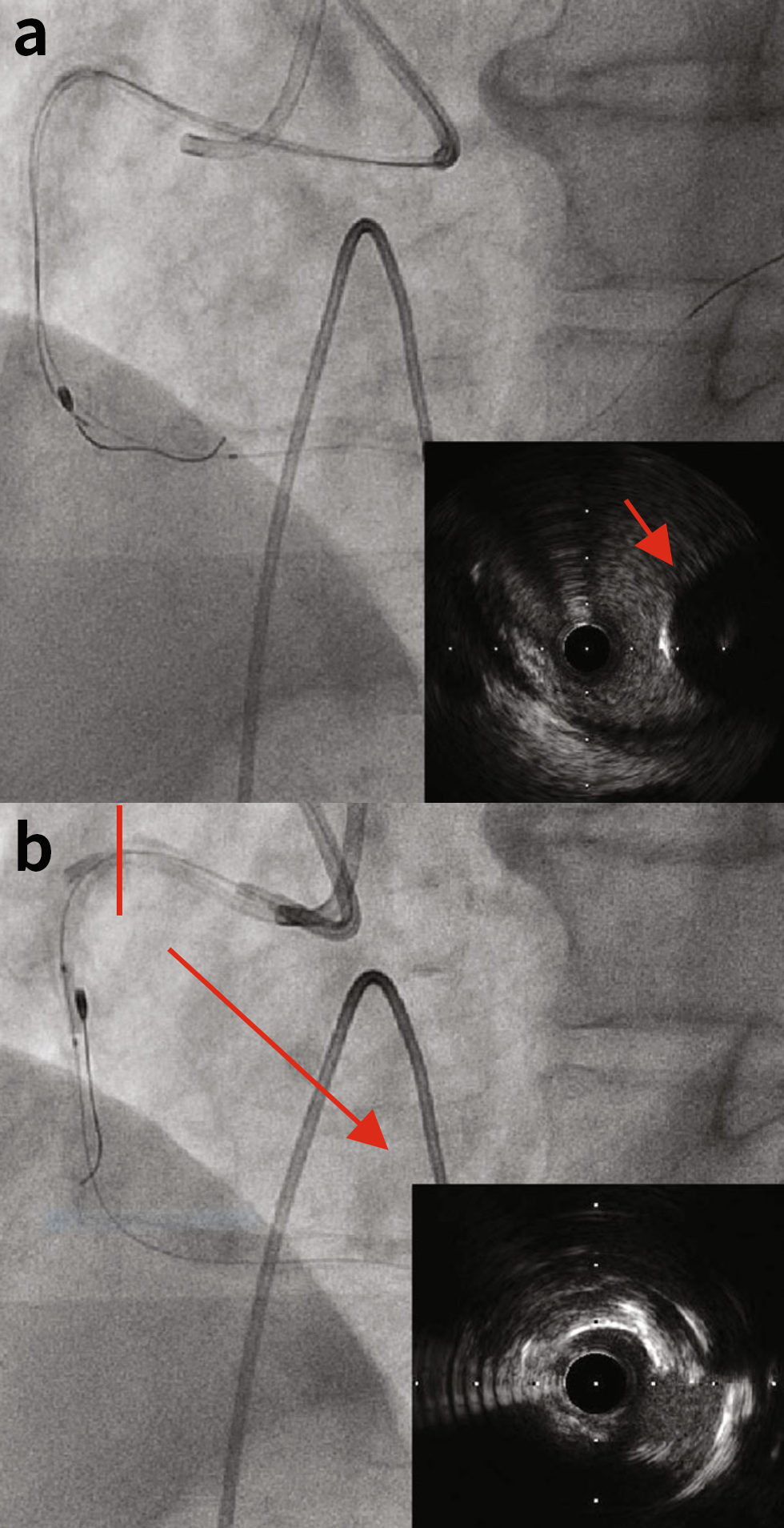 图3.(a)使用IVUS观察旋磨头。旋磨头没有被困住。(b)在被卡住的磨头旁边以2.5mm球囊扩张。IVUS观察到RCA近端病变的内侧被消蚀。