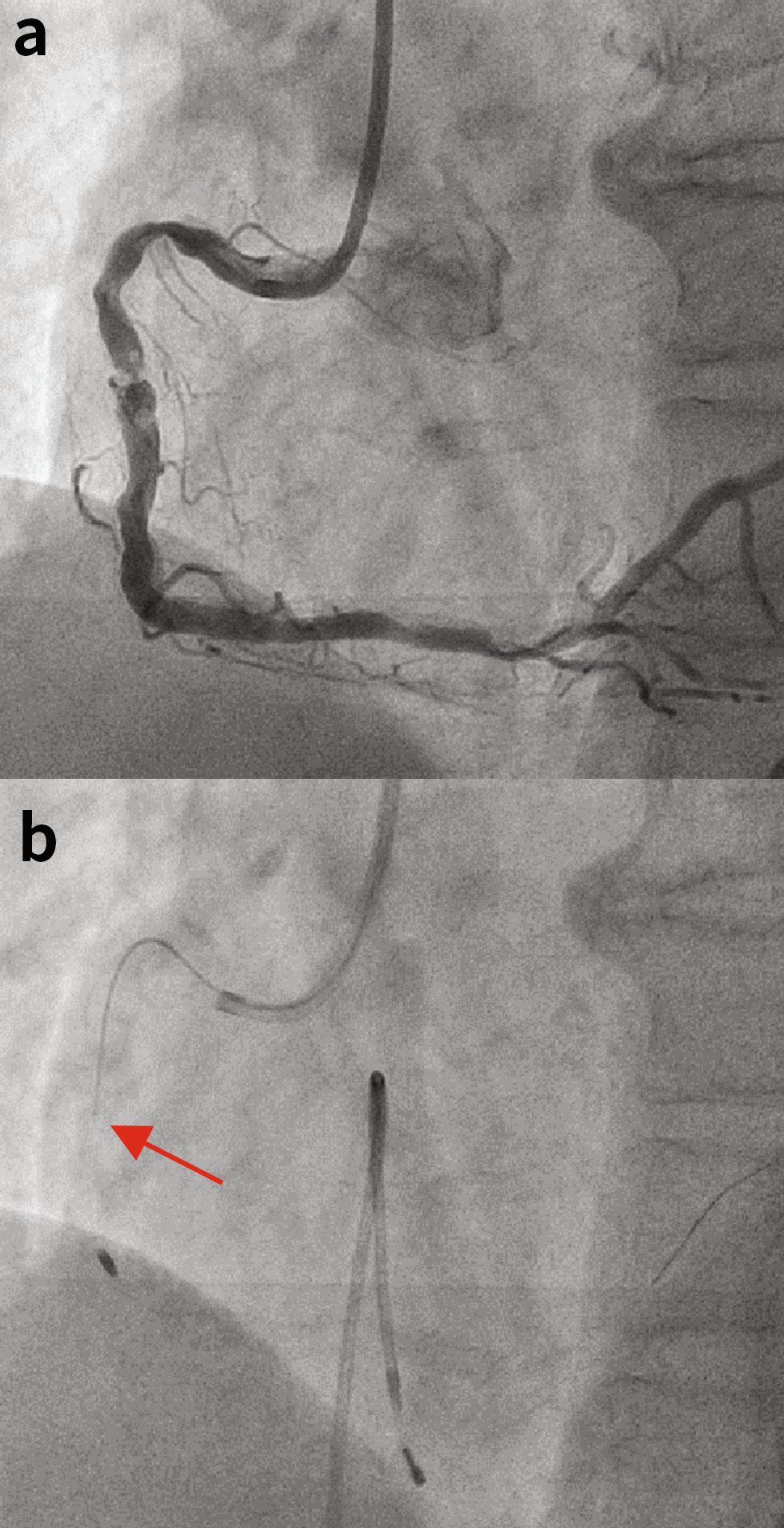 图1.(a)基线冠状动脉造影。(b)驱动轴与磨头分离(红色箭头表示驱动轴的边缘)。