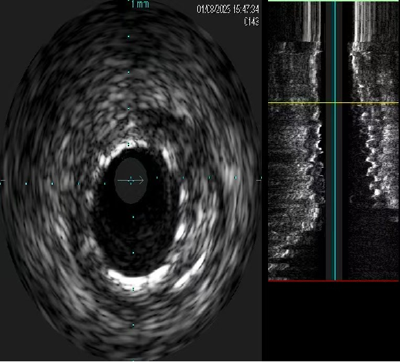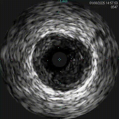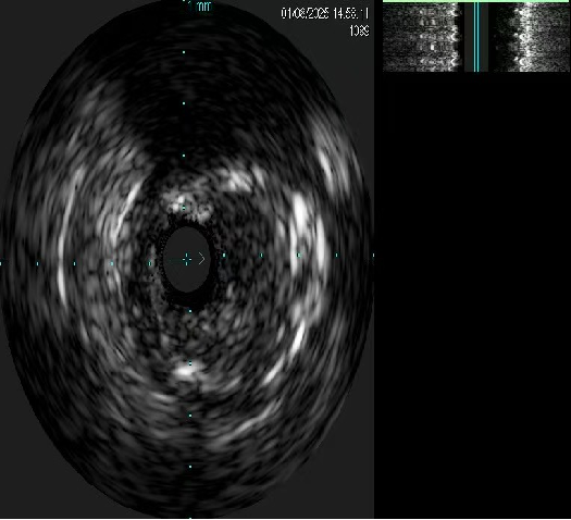 送入IVUS导管查看支架开放良好、贴壁良好,未见夹层、血栓等 并发症。
