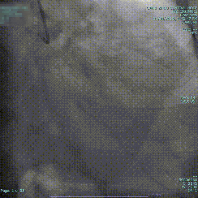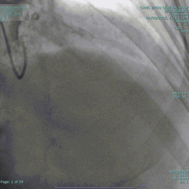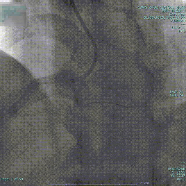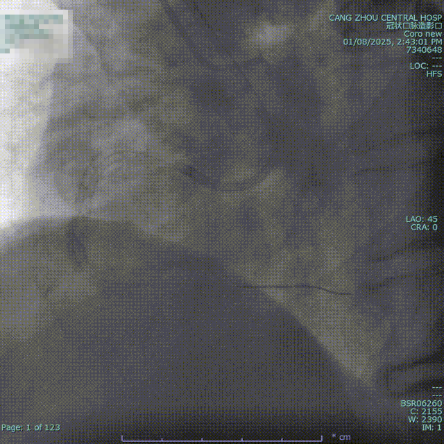 送入GC(7F SAL1.05至右冠开口,送入GW1(NS)至RCA近端闭塞段,导入APT微导管,撤出GW1送入GW2(XT-R)不能通过闭塞段,撤出GW2送入GW3(Gaia 2),通过闭塞段到达RCA远端。