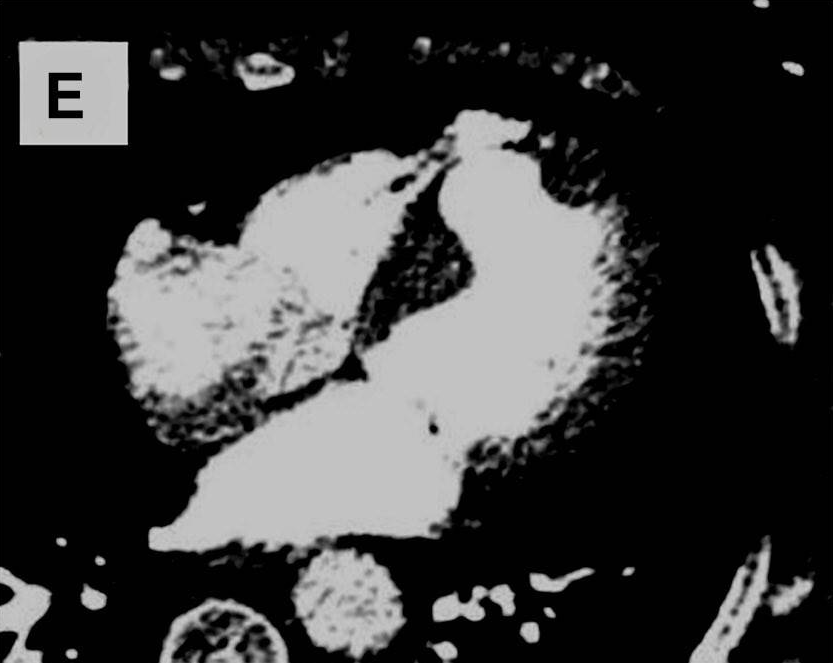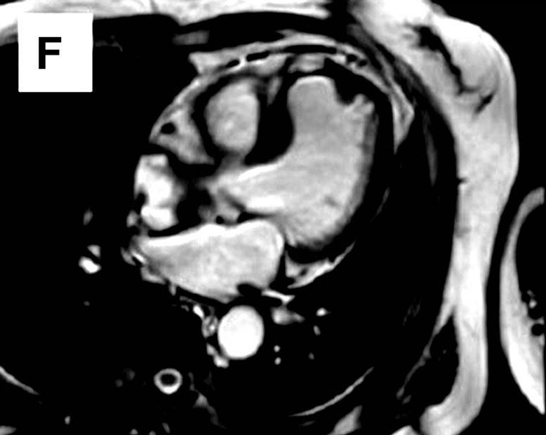 图为心电图、冠状动脉造影、经胸超声心动图、CTA及MRI检查结果。心电图显示v2-4导联T波改变(图A)。左心室造影可见室间隔肌部瘤(图C)。超声心动图显示室间隔瘤样结构(图D)。CTA与MRI均显示巨大室间隔肌部瘤(图E、F)。