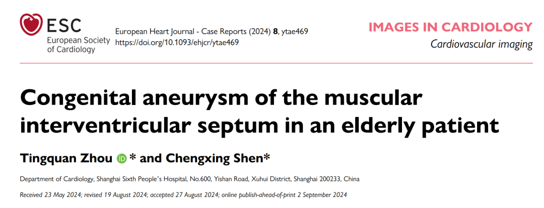 室间隔肌部瘤(Muscular Ventricular Septal Aneurysm, MuVSA)是一种罕见的心脏病变,是指室间隔肌部局灶性变薄,收缩强度减弱,在左右心室压力阶差下,变薄的局部突向右心室一侧,形成瘤样结构,伴或不伴矛盾收缩期扩张。室间隔肌部瘤分为先天性和继发性两种。先天性MuVSA较为罕见,病因尚不明确,可能与胚胎发育过程中的内在异常、子宫内病毒感染或冠状动脉异常导致短暂缺血引起心肌损伤有关,通常与室间隔缺损或特发性异常有关。继发性多由心肌梗死、心肌炎、心脏外伤等引起。近期,上海交通大学附属第六人民医院沈成兴教授团队在《Eur Heart J Case Rep》发表了一篇题为“Congenital aneurysm of the muscular interventricular septum in an elderly patient”的案例报道,值得各位同道参考。