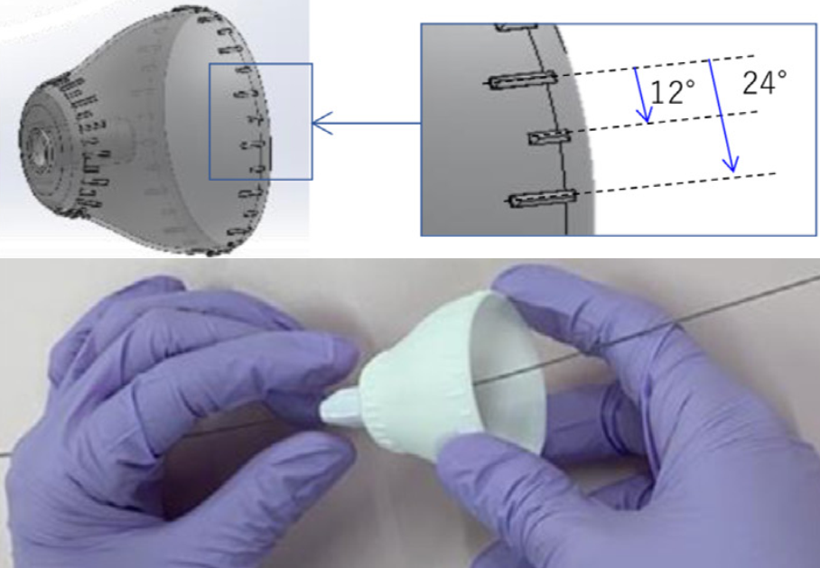 3.更换为高穿透力导丝(如Gaia Next 4导丝、Conquest 12g导丝,以及正在研发中的15g预成型专用远端纤维帽穿刺导丝),导丝头端1mm处弯曲45°,并在导丝上使用扭控装置,因为透视下3D导丝正向穿刺技术需要精确的旋转角度。为此,正在开发一种特殊的“Sake Cup扭控增强”装置(图2)。