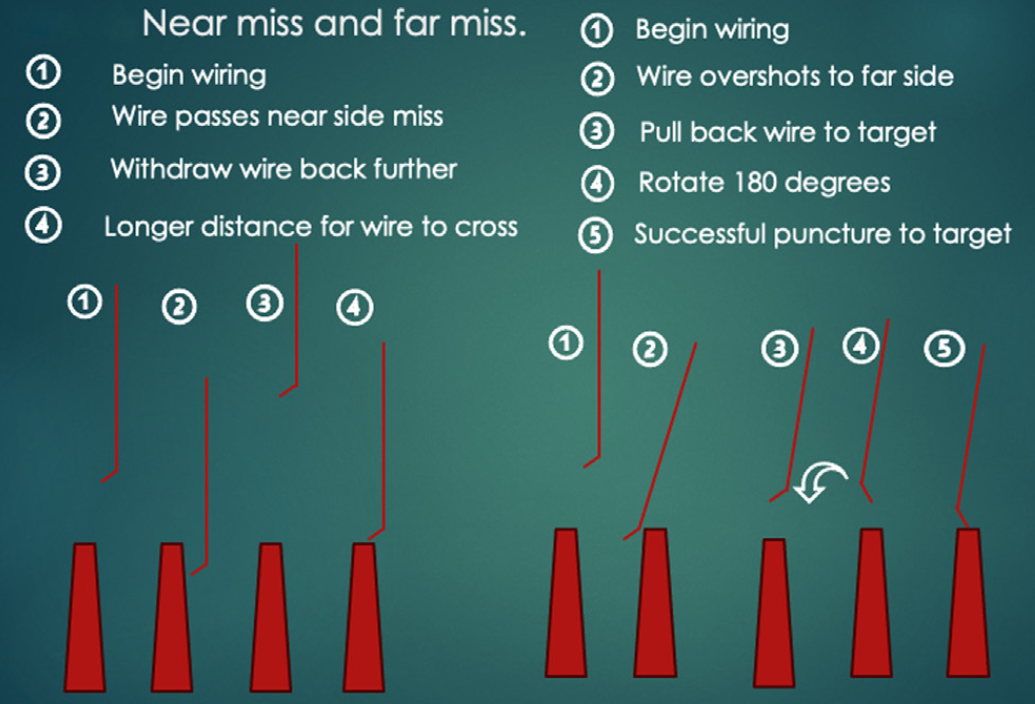 4) 在近视角中,旋转导丝头端,直到它开始朝目标移动,然后在远视角中观察导丝并向前推送;