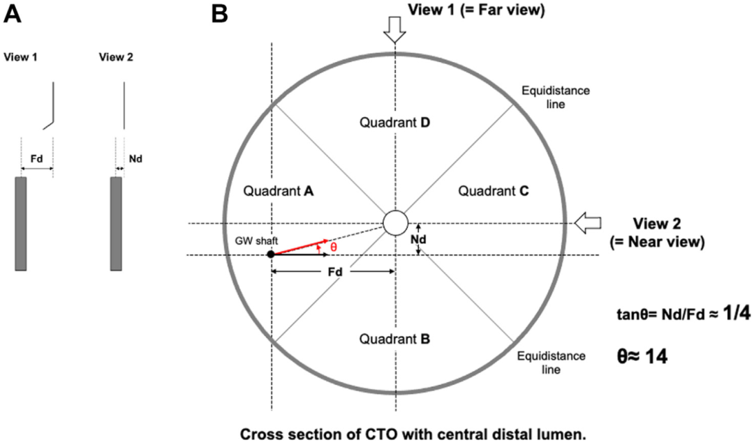 (A)展示了近视角距离和远视角距离的测量;(B)冠状动脉(大灰色圆圈)通过视角1(远视角)和视角2(近视角)进行观察。两条对角线将冠状动脉分为四个象限。位于对角线上的导丝在两个视角中到CTO远端真腔的距离相等,但位于象限A和C的导丝在视角1中的距离会比在视角2中更远,使视角1成为远视角;相反,位于象限B和D的导丝在视角2中的距离会比在视角1中更远。导丝(小黑点)位于象限A,Nd约为Fd的四分之一,因此θ为14°。