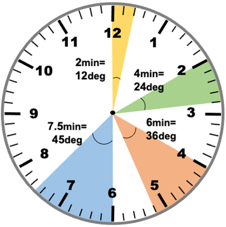 此表盘展示了与分钟相对应的角度。从12点至2分钟为12°(黄色);从2点至14分钟为4分钟,对应24°(绿色);从4点至26分钟为6分钟,对应36°(粉色);从6点至37.5分钟为7.5分钟,即45°(蓝色)。