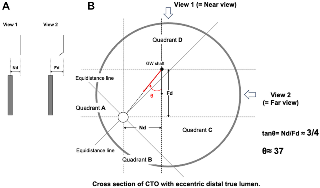 (A)图中展示了Nd(近视角距离)和Fd(远视角距离)的测量方法;(B)图,通过视角1(近视角)和视角2(远视角)观察到冠状动脉(大灰色圆圈)。远端真腔位置偏于一侧(小圆圈)。从远端真腔延伸出的两条对角线将冠状动脉分为四个象限。位于对角线上的导丝在近视角和远视角中到CTO远端真腔的距离相等,但位于A象限和C象限的导丝在视角1中比在视角2中更远,这使得视角1成为远视角,相反,位于B象限和D象限的导丝在视角2中比在视角1中更远。导丝(小黑点)位于D象限,因此视角1成为近视角。近视角的Nd约为远视角Fd的四分之三,因此θ为37°。
