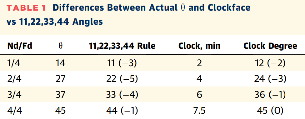 透视下3D导丝正向穿刺技术基于简单的数学三角模型,即在直角三角形中,角度θ可以通过公式正切θ = 对边/邻边得出(图5)。通过测量在近视角(导丝更接近目标)中导丝头端近侧直段与纤维帽中心纵向投影线之间的距离(Nd),并将其除以在相隔90°的远视角(导丝离目标更远)中导丝头端近侧直段与纤维帽中心纵向投影线之间的距离(Fd),可以形成一个直角三角形,其中Nd为对边,Fd为邻边。通过计算Nd/Fd的正切值,我们可以得到角度θ(图6)。可以在科学计算器上使用tan(Nd/Fd) = θ的功能进行计算,得出tan(1/4) = 14°;tan(2/4) = 26.6°;tan(3/4) = 36.9°;tan(4/4) = 45°。因此,如果Nd/Fd为1/4,则应将导丝旋转14°;如果Nd/Fd为2/4,则应旋转27°;如果Nd/Fd为3/4,则应旋转37°;如果Nd = Fd,则应旋转45°。我们建议使用11°(用于Nd/Fd 1/4)、22°(用于Nd/Fd 2/4)、33°(用于Nd/Fd 3/4)和44°(用于Nd/Fd 4/4),因为这些角度更容易记忆,并且每个Nd/Fd较小的角度可以避免过度旋转导丝。如果使用表盘来理解需要旋转的量,表盘面上的2分钟是12°,4分钟是24°,6分钟是36°,45°是7.5分钟(图7)。表1比较了11、22、33、44方法与表盘与实际θ之间的差异,括号中表示了不同方法之间的角度差异。