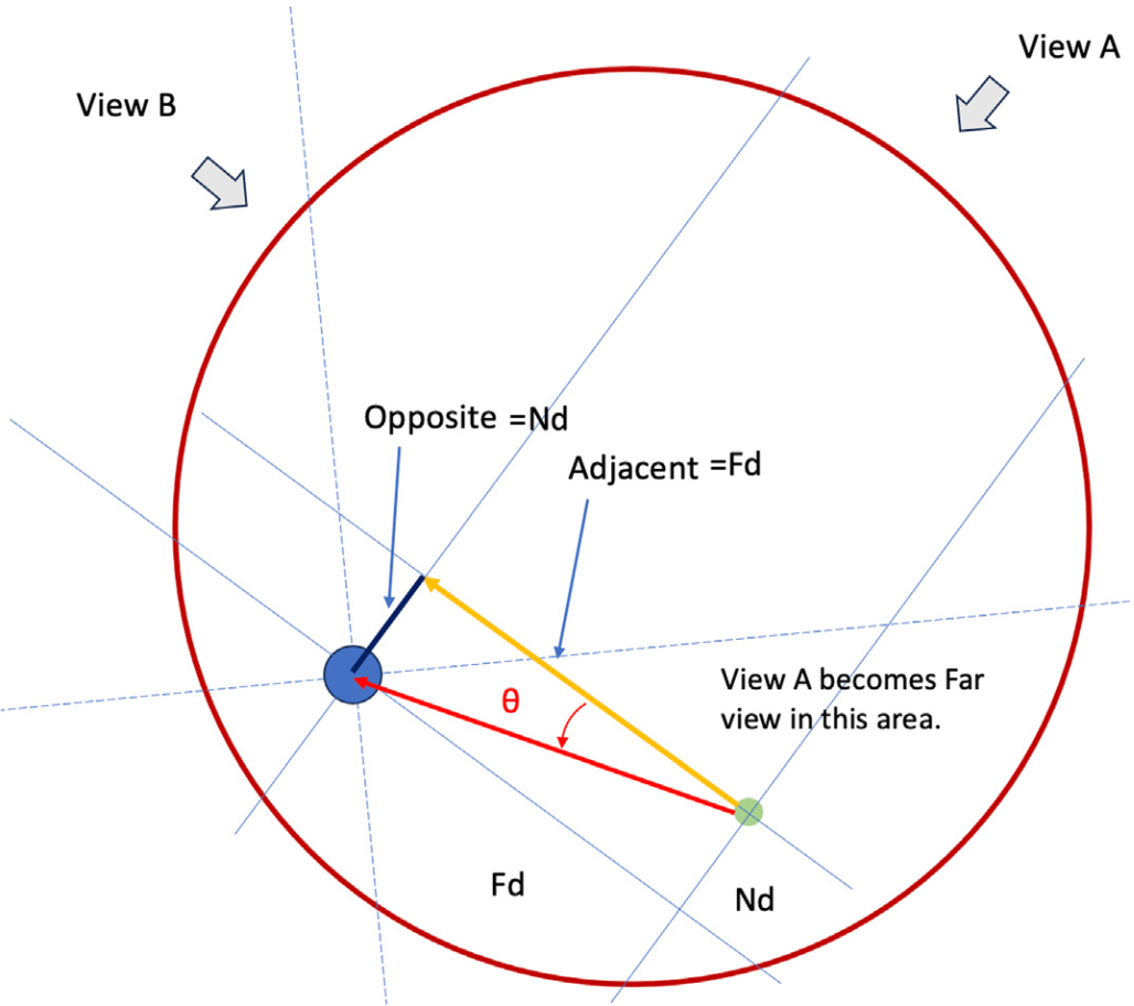 在此冠状动脉(红色圆圈)示意图中,通过两个相隔90°角的血管造影视角(视角B和视角A)进行观察,导丝位置(绿色点)远离CTO远端真腔目标(蓝色点)。在视角B中,导丝到远端目标的距离(黑线)较短,因此视角B为近视角,该距离Nd对应于直角三角形中的对边。同样,视角A为远视角,导丝与远端目标在视角A中的距离Fd(黄线)对应于直角三角形的邻边。因此,角度θ,即导丝需要旋转到正对目标的角度,可简单计算为tanθ=Nd/Fd。