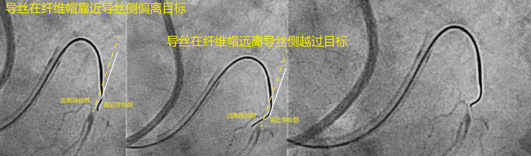 4.远端纤维帽穿刺。旋转后,应回到远视角,观察导丝向前穿刺到远端纤维帽的情况。