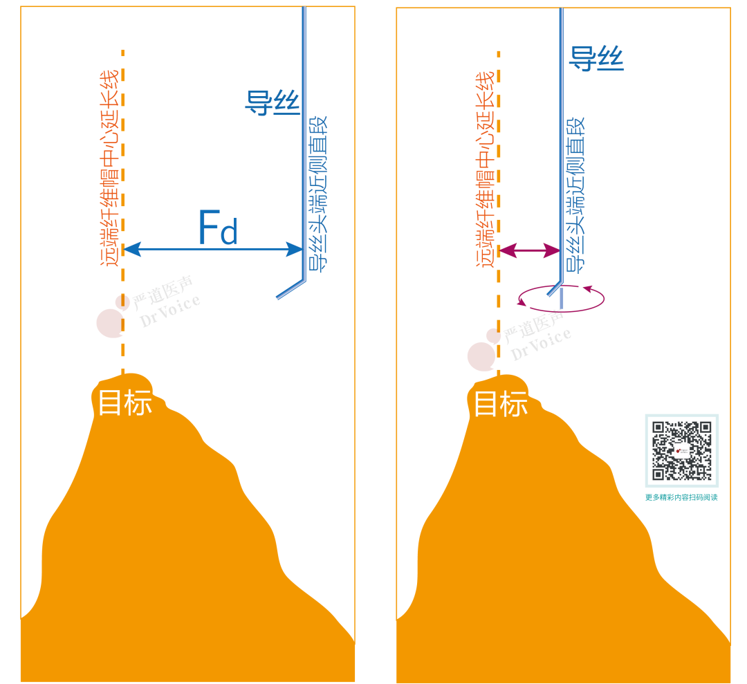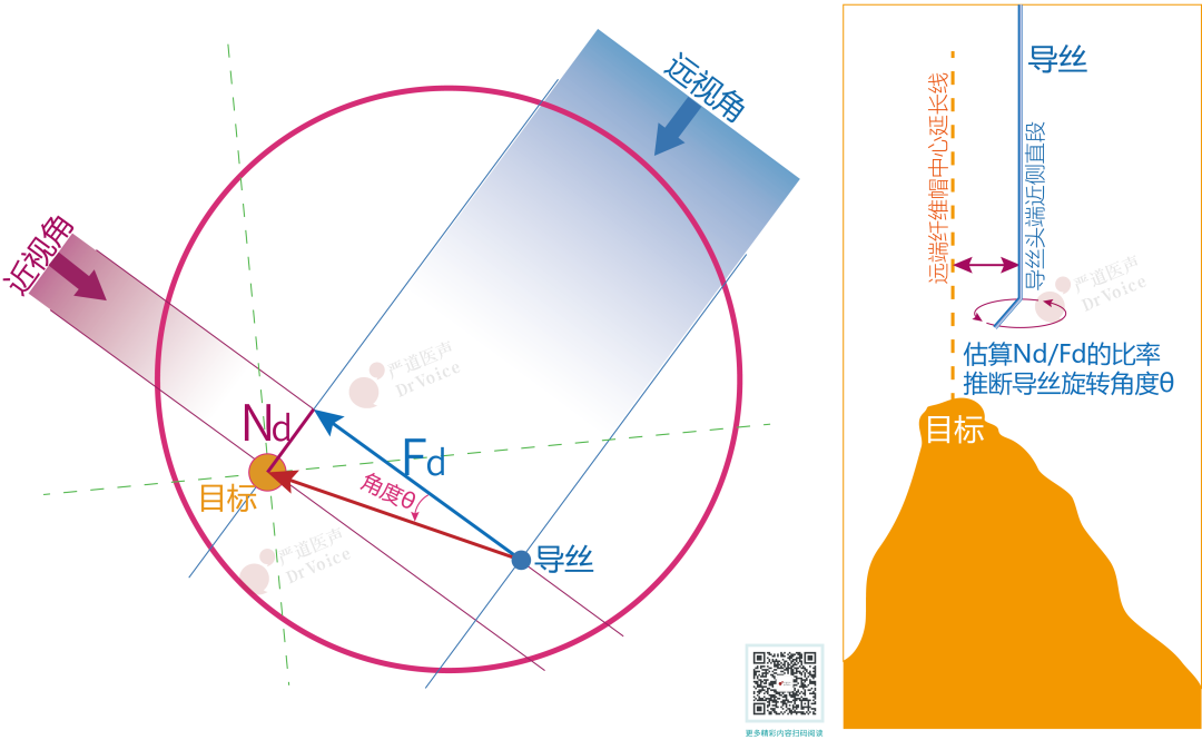 如果在远视角中将导丝向目标旋转,并在近视角中将导丝拉直,通过小幅旋转,导丝将指向3点钟方向(图8中的粗黑箭头);因此,为了使导丝头端对准目标(图8中的粗红箭头),导丝应旋转角度θ。在这里,tanθ可以表示为Nd除以Fd(Nd/Fd),在此例中为1/4,得出θ为14°。