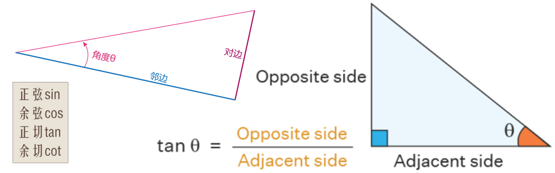 这是一个经典的直角三角形,其对边和邻边已被标记。角度θ可通过以下公式计算:正切θ=对边/邻边。