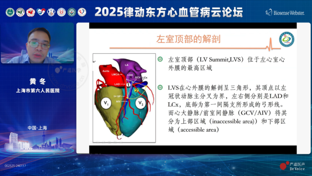 上海市第六人民医院黄冬教授首先简要介绍了左室顶部的解剖及左室顶部不同部位起源室早的心电图、腔内电图特点。他指出,左室顶部不同部位的解剖和毗邻关系会影响消融难度及成功率。黄教授从左室顶部起源室早多次消融的病例出发,分享了自身消融经验。关于左室顶部的标测和消融,他提到,经皮心外膜途径可以直接到达左室顶部,但消融受限于与冠脉距离过近及心外膜较厚的脂肪层。起源于左室顶部区域的室性心律失常常针对心大静脉远段、主动脉窦消融,以及其他毗邻结构如主动脉瓣下或右心室流出道间隔部等。黄教授强调,激动标测是特发性室性心律失常的常规方法,可辅助起搏标测确认“靶点”。对于冠状静脉-心大静脉内消融,距离冠状动脉安全距离应大于5mm;冷盐水流速为30-60ml/min,阻抗高限为300欧姆,或关闭阻抗。同时,黄教授还分享了常规方法消融失败后,为提高成功率可采用不同途径,如双极消融、针状导管消融或化学消融等,并概括介绍了左室顶部室性心律失常消融的整体流程。