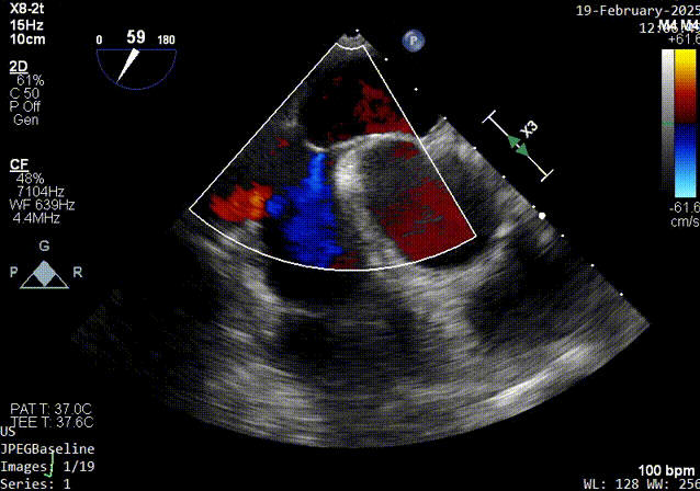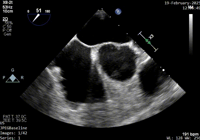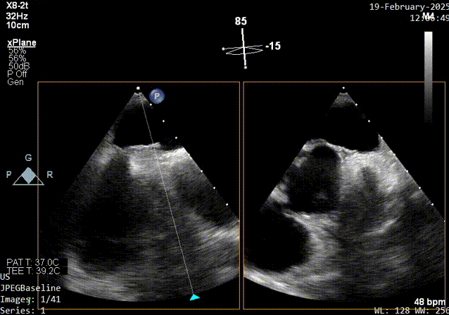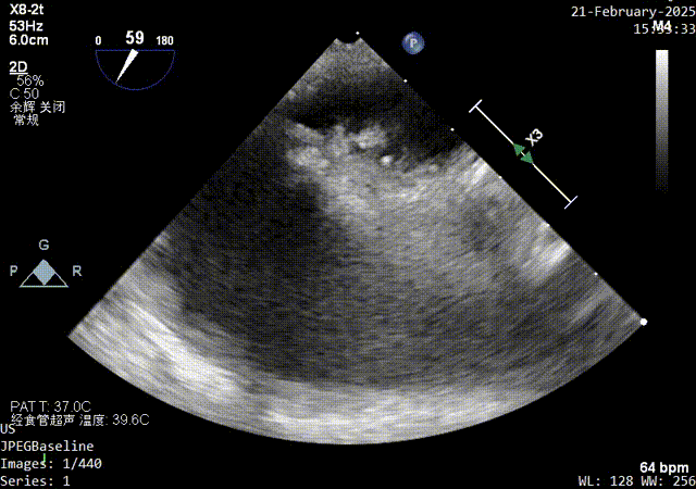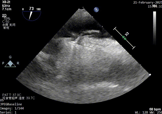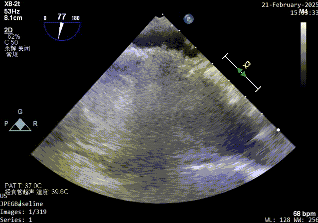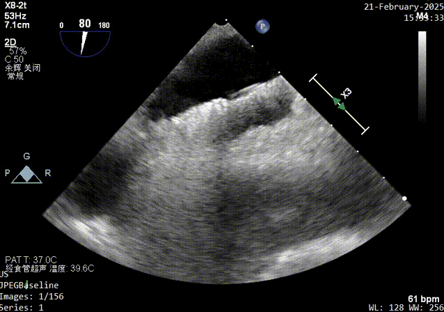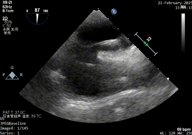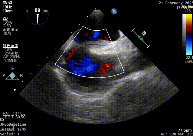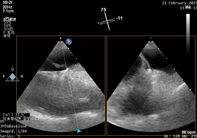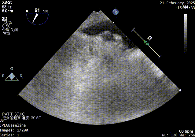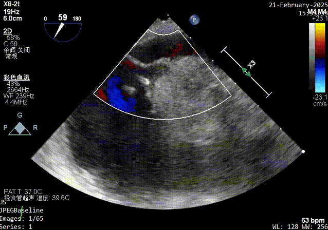 经食道超声:房间隔卵阙窝边缘见卵圆瓣闭合不佳,可见一隧道样缝隙,长约16mm,左房面约1.6mm,右房出口约1.0-2.3mm,X-plane短轴切面而测得宽度约10mm,CDFI可在该处探及左向右过血流。原发隔卵圆瓣厚约1.3mm,继发隔厚度约4.4mm,右房面出口距主动脉根部约7mm,距上腔静脉入口约19mm。